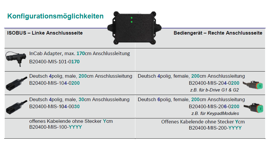 | B20400-MIS-10X-YYYY | Anschlusskabel ISOBUS – Linke Seite: | |